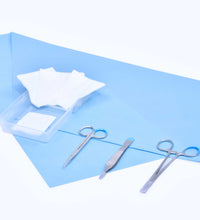 Designed for precision and reliability, this sterile, single-use kit includes premium surgical instruments—Crile Wood Needle Holder (15 cm), Iris Scissors (11.5 cm), and Adson Forceps (12 cm)—alongside nonwoven swabs and a large 50×60 cm two-layer drape for optimal field prep.